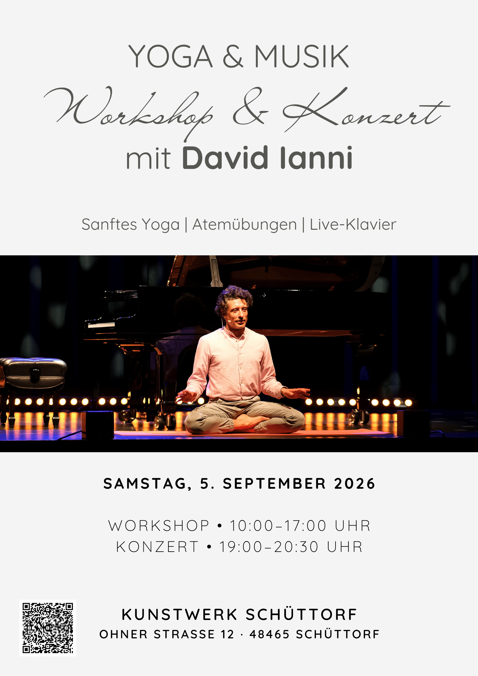 Am Samstag, den 05. September 2026, lädt der Pianist und Komponist David Ianni zu einem besonderen Klavierabend ins KunstWerk Schüttorf ein. Unter dem Titel »Musik – Stille – Transzendenz« verbinden Iannis Kompositionen harmonische Klarheit und berührende Melodien mit Momenten bewusster Stille und öffnen einen Raum der Sammlung und inneren Weite. Das Konzert richtet sich an Menschen, die Musik als Weg der Transzendenz erleben möchten.