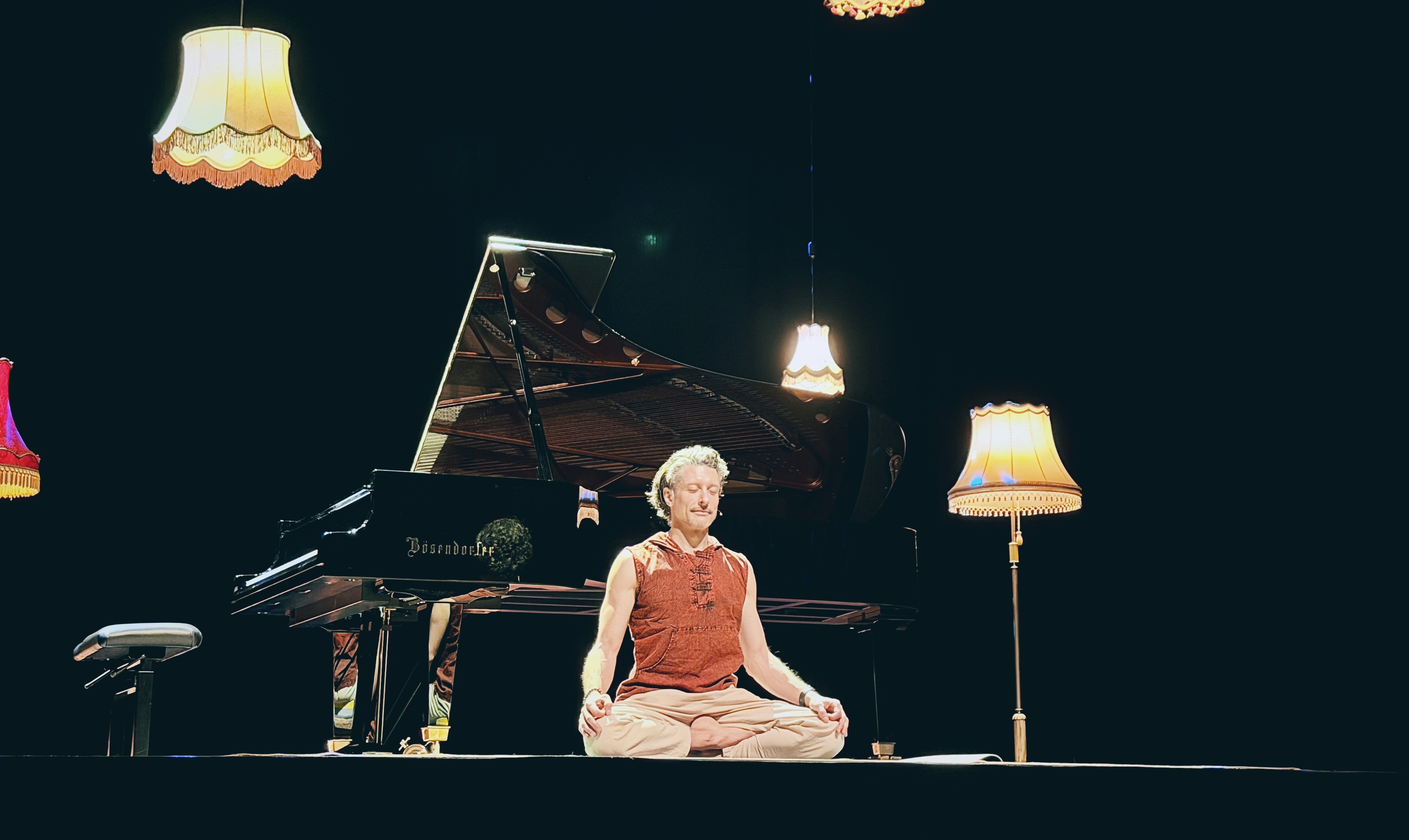 Ich spiele auf einem Flügel oder Klavier, falls vorhanden, oder ich bringe ein hochwertiges E-Piano mit Lautsprechern mit. Wir benötigen etwa 25-30 m² freie Fläche für die Yogapraxis sowie eine ruhige, achtsame Atmosphäre. Schreibe mir gerne unter Kontakt, um Details zu besprechen.